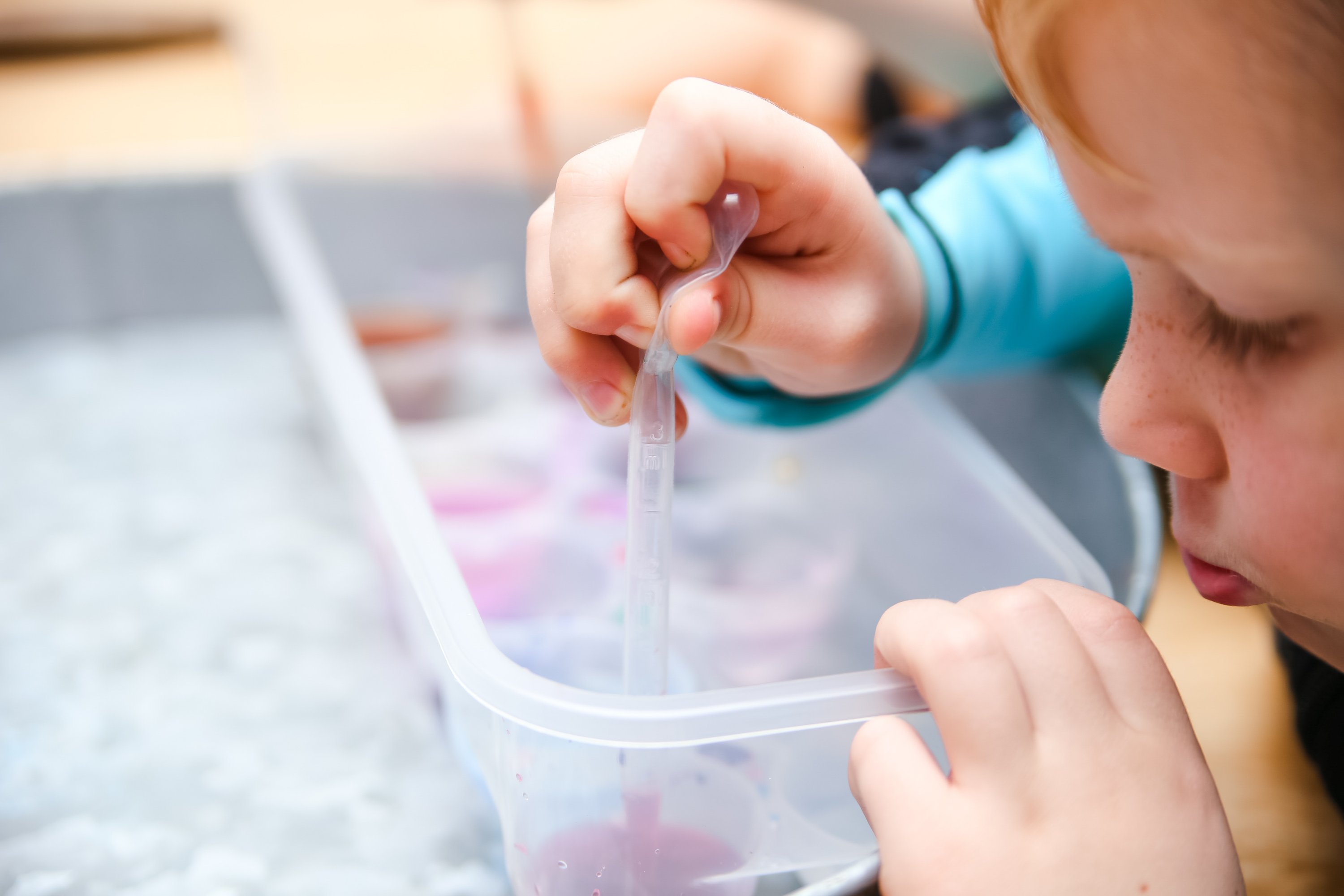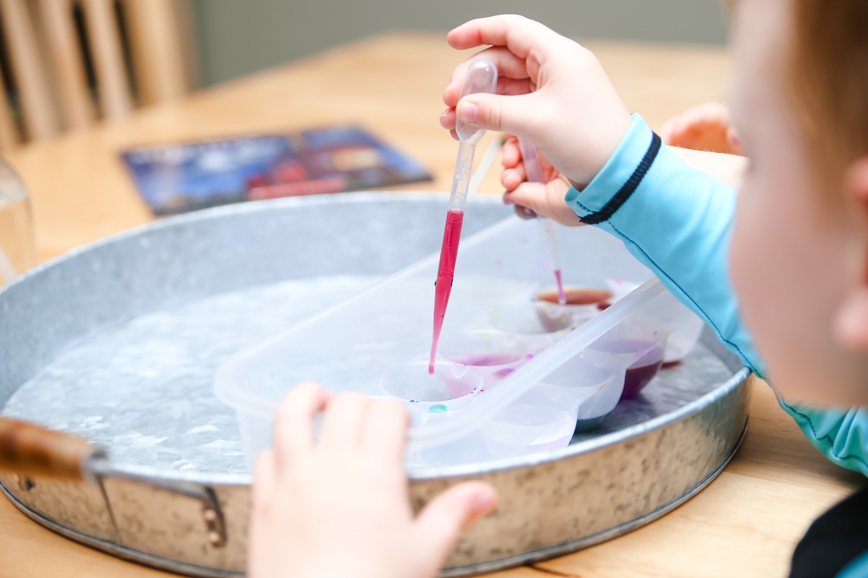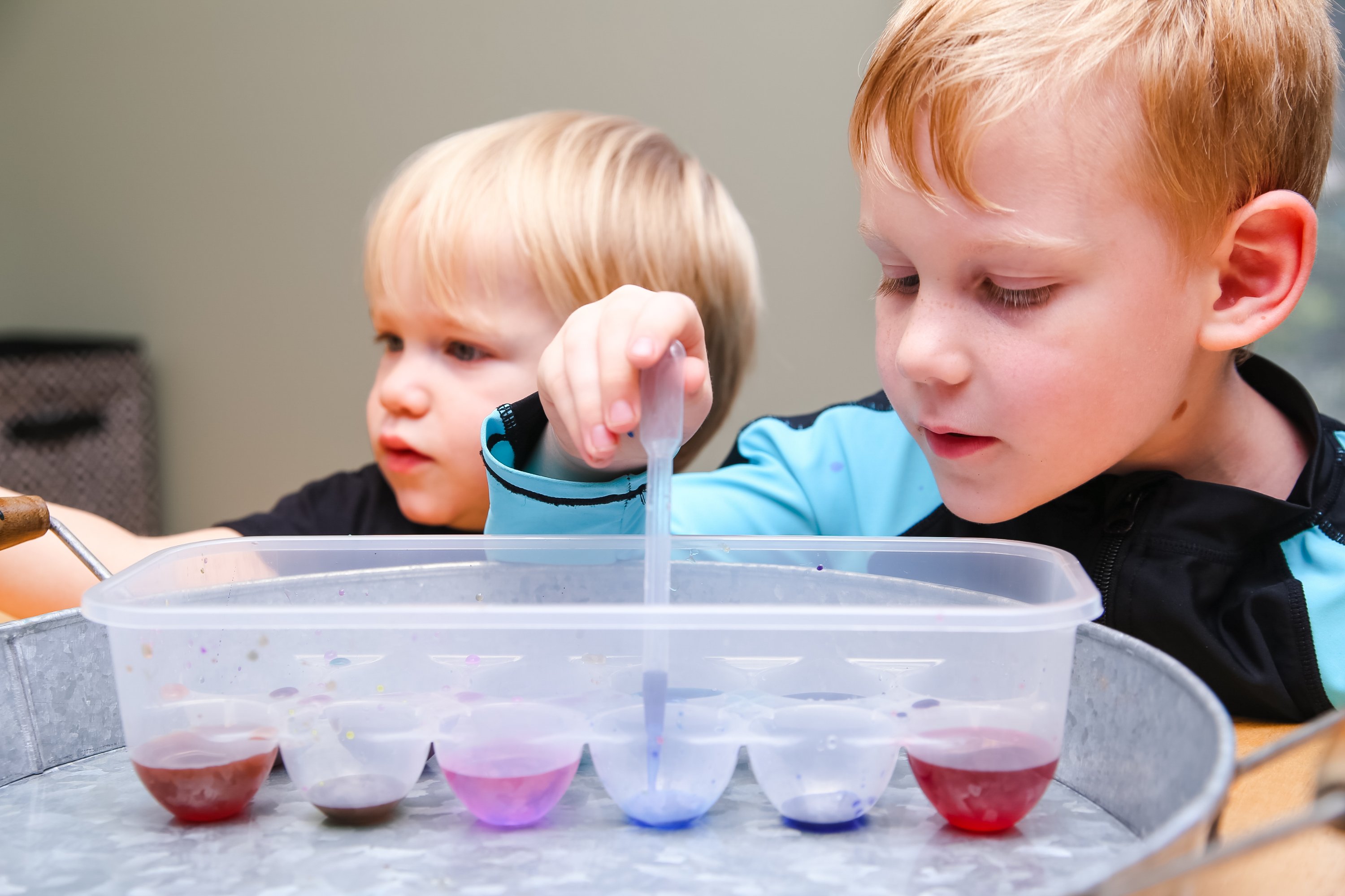 For this activity, just drop a few drops of coloring in every other cube slot. For coloring I prefer using Sargents Watercolor-it’s washable, makes pretty colors, and is nontoxic. Fill up the empty ones with water. Then let the fun begin! We used pipettes to mix the colors and many cool combinations ensued! During this activity, we discussed what was happening to the colors and named them. Finn struggled a little bit with the pipette, but he liked using it as a stir stick!