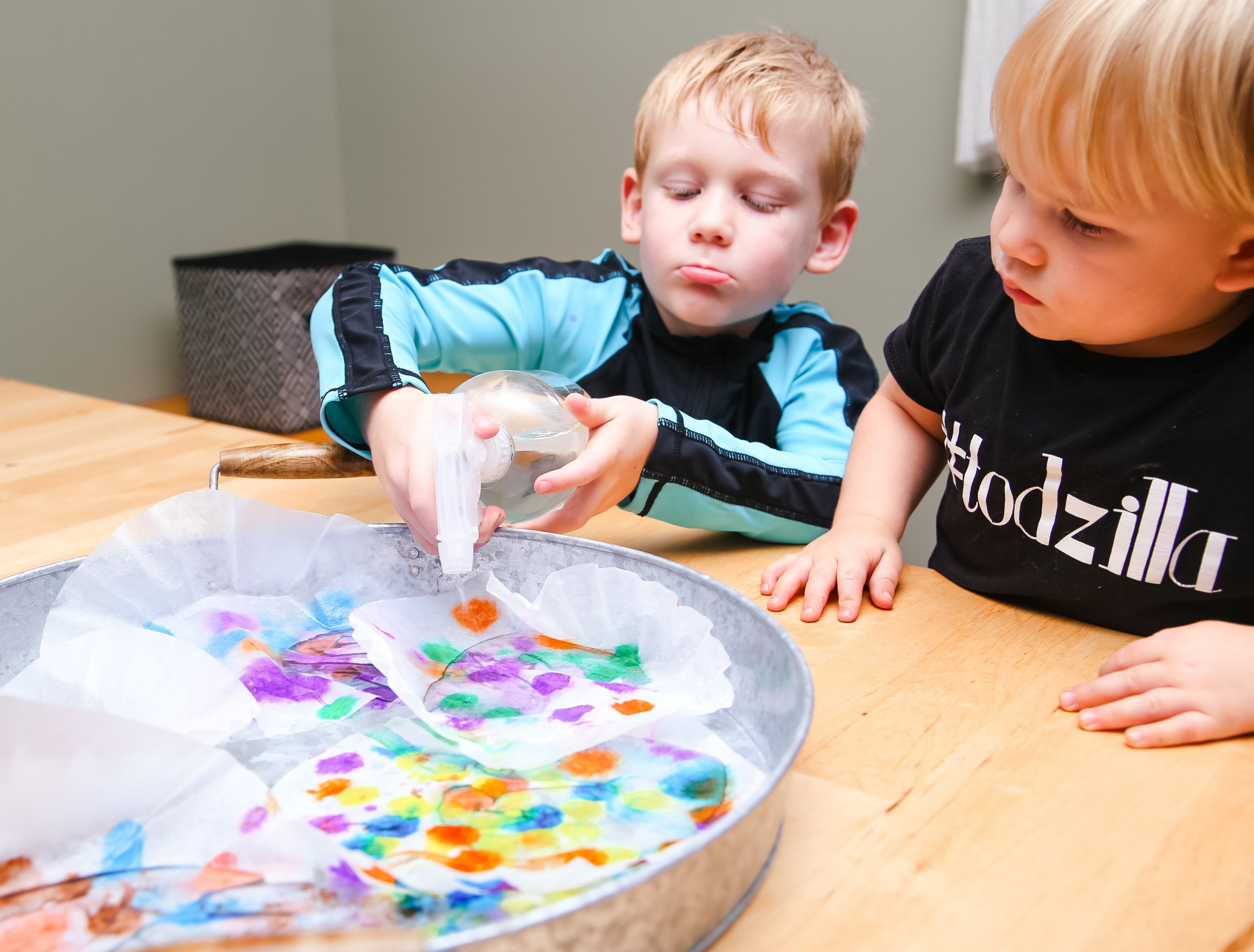 After the singular colors, the kids wanted to dab all kinds of crazy colors on the filters to see what would happen. The results weren’t as dramatic, but the kids still had a blast!