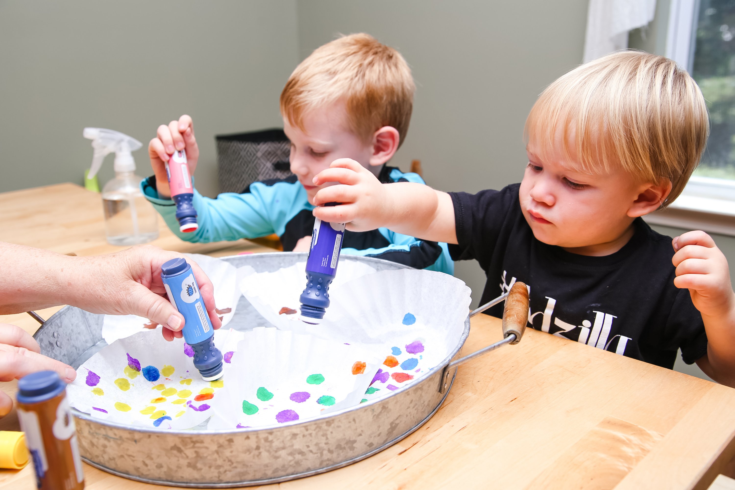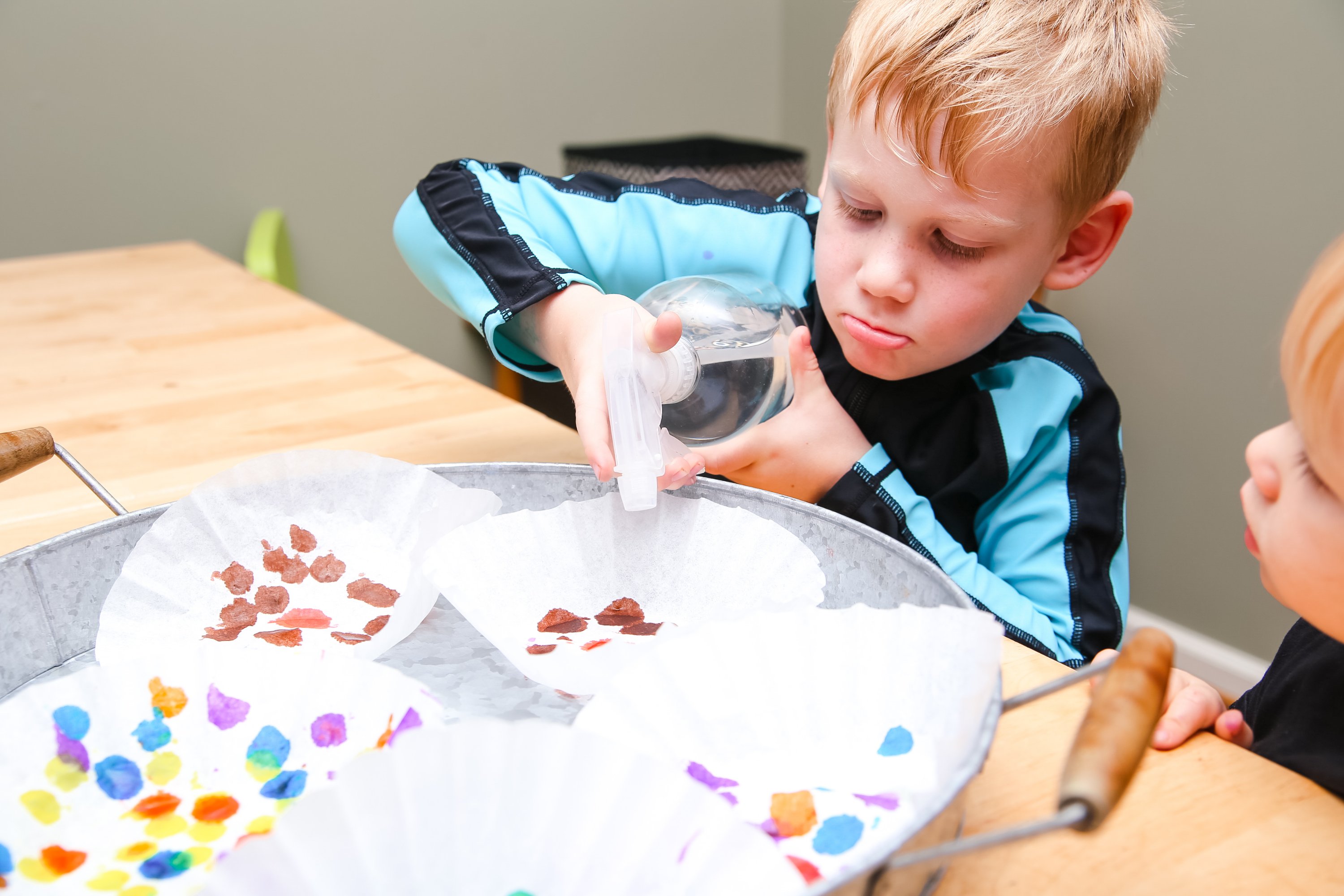 For Finn, we worked on holding the dabber correctly and identifying colors. Everett on the other hand, got quite the lesson! In addition to color identification, I also taught him chromatography and capillary actions.